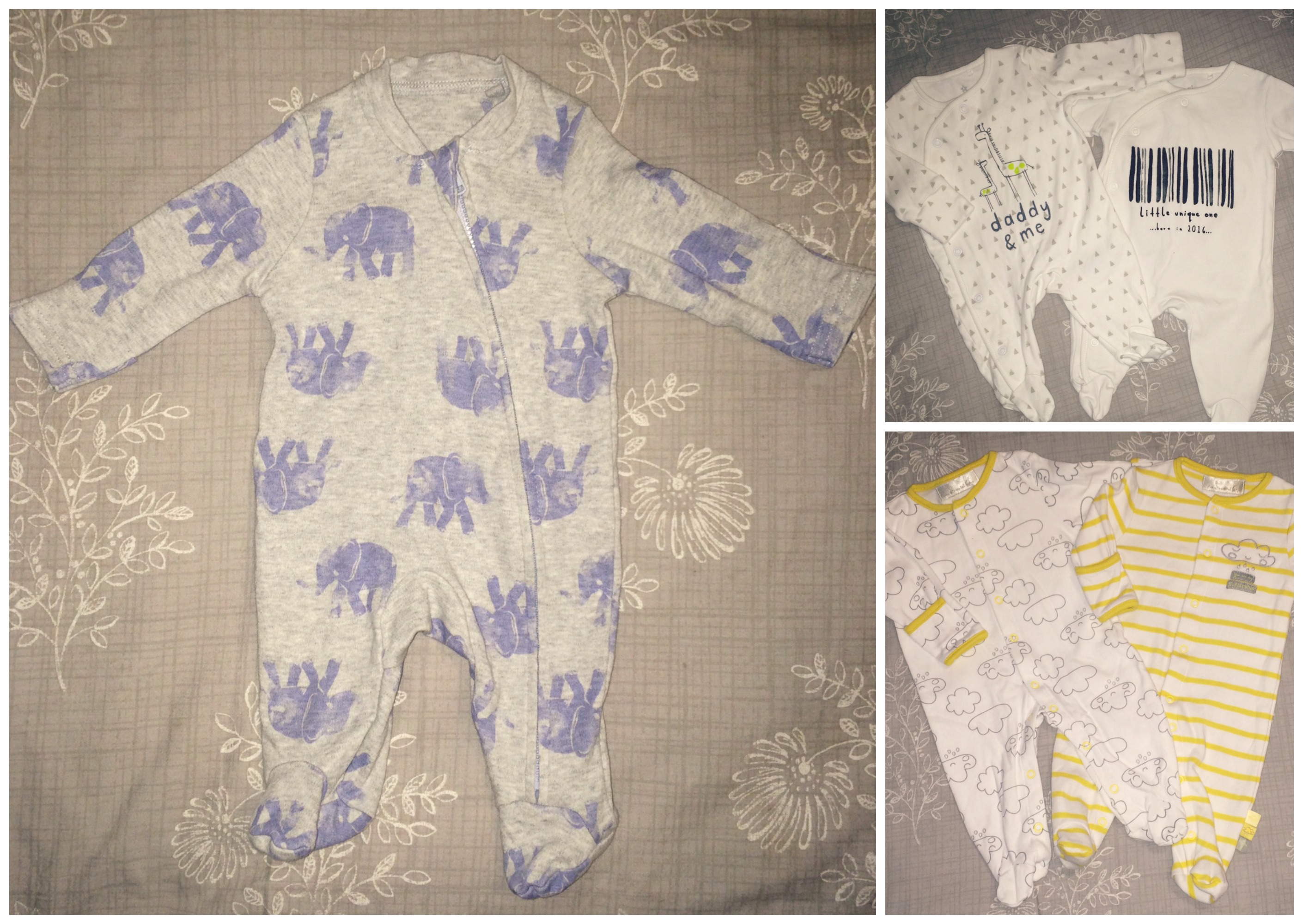 - Grey/blue elephant print sleepsuit is from Sainsburys.