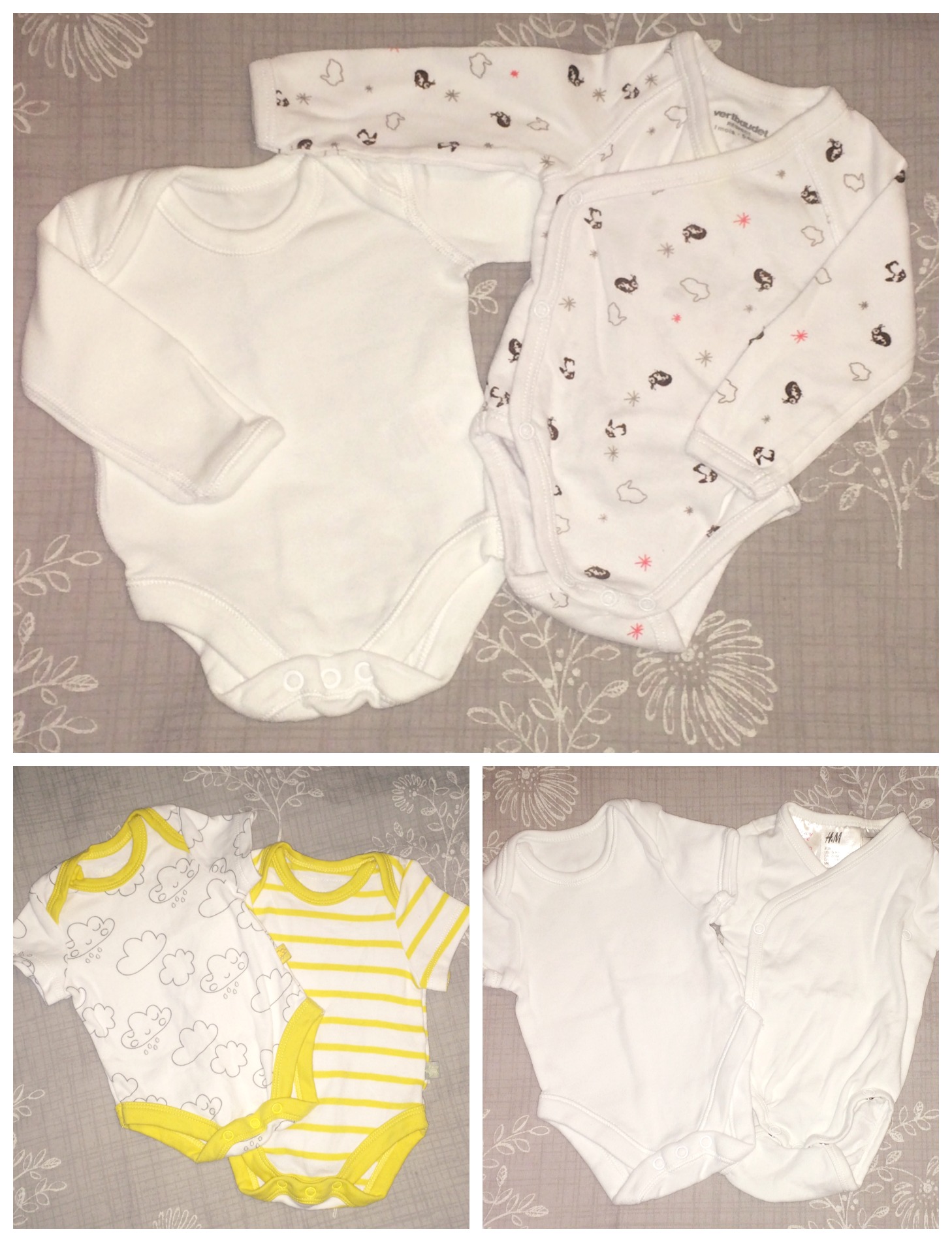 - Yellow/white cloud/stripe sleepsuits are from The Essential One.